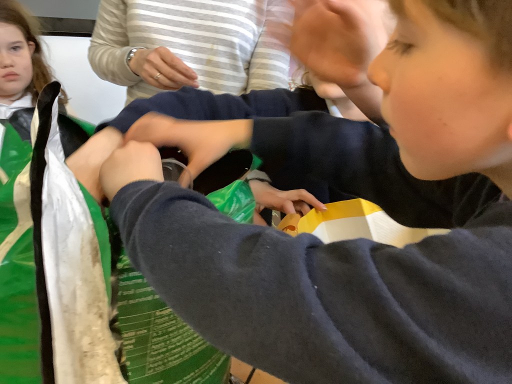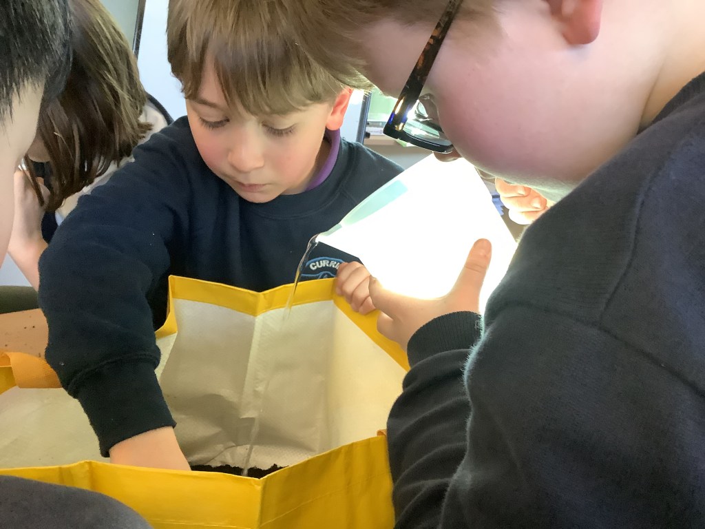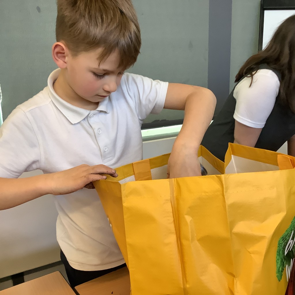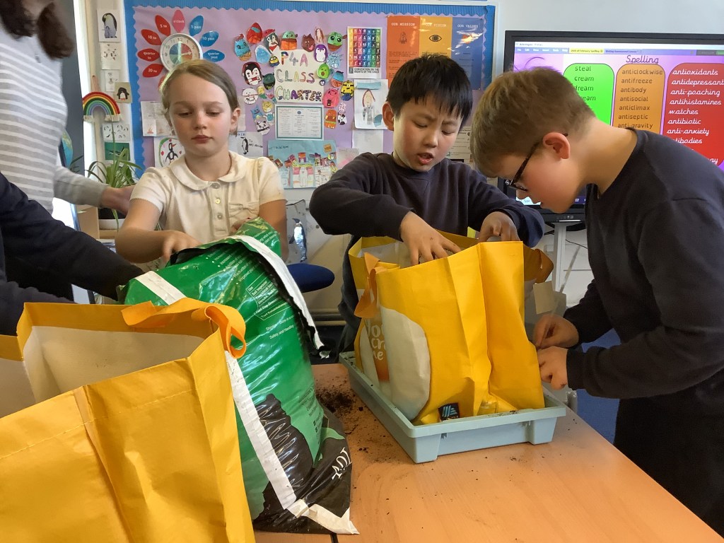 At Currie Primary School 3 P4 classes had a visit from a farmer to talk about how to plant potatoes. We planted the potatoes in an Aldi bag and we are working hard to protect and care for them. They need watering and feeding twice a week. We are entering a RHET competition and there are prizes for the biggest potato and the most potatoes! We are excited to see the potatoes we have grown.