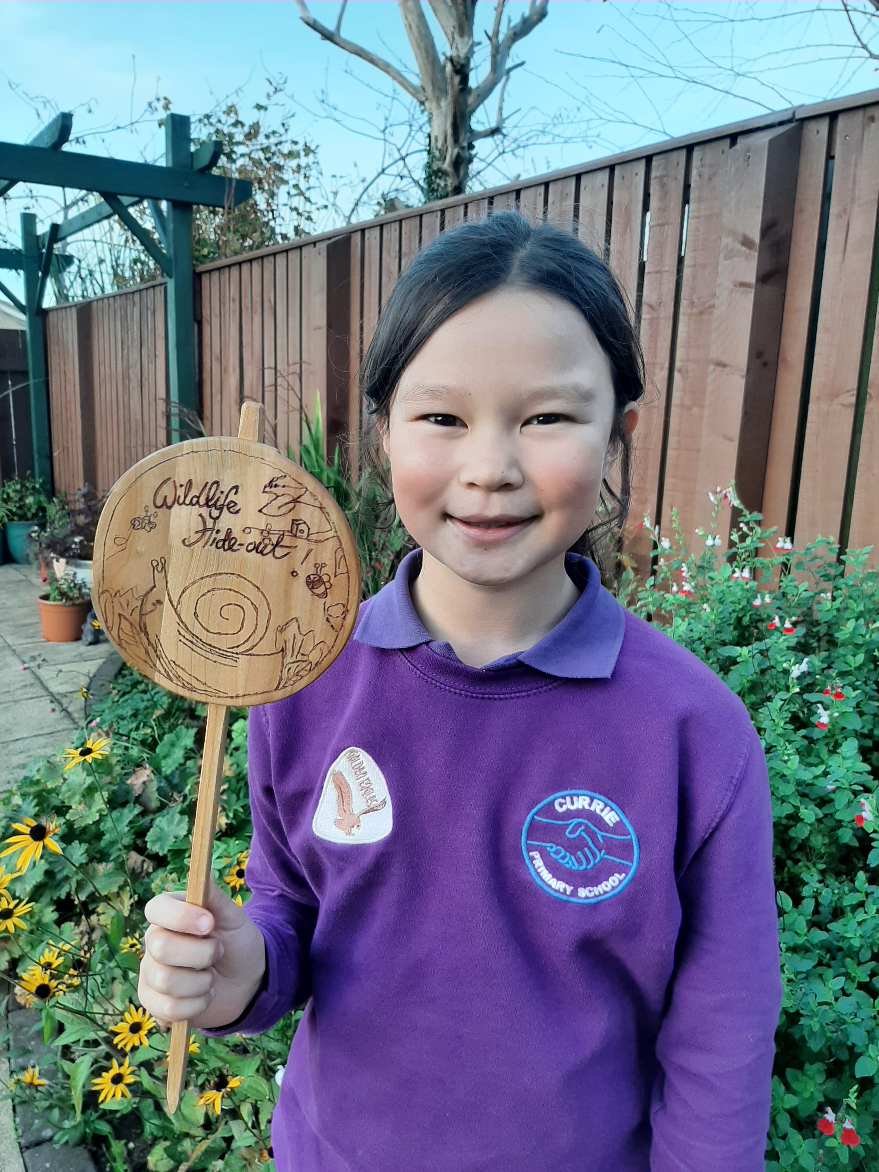 Congratulations to Sophia in P4 for her winning garden sign design! Sophia took part in BalernoPesticideFree garden sign design competition. The artwork has specifically engraved on the woodwork by The Garvald workshop. Isn’t it beautiful!
