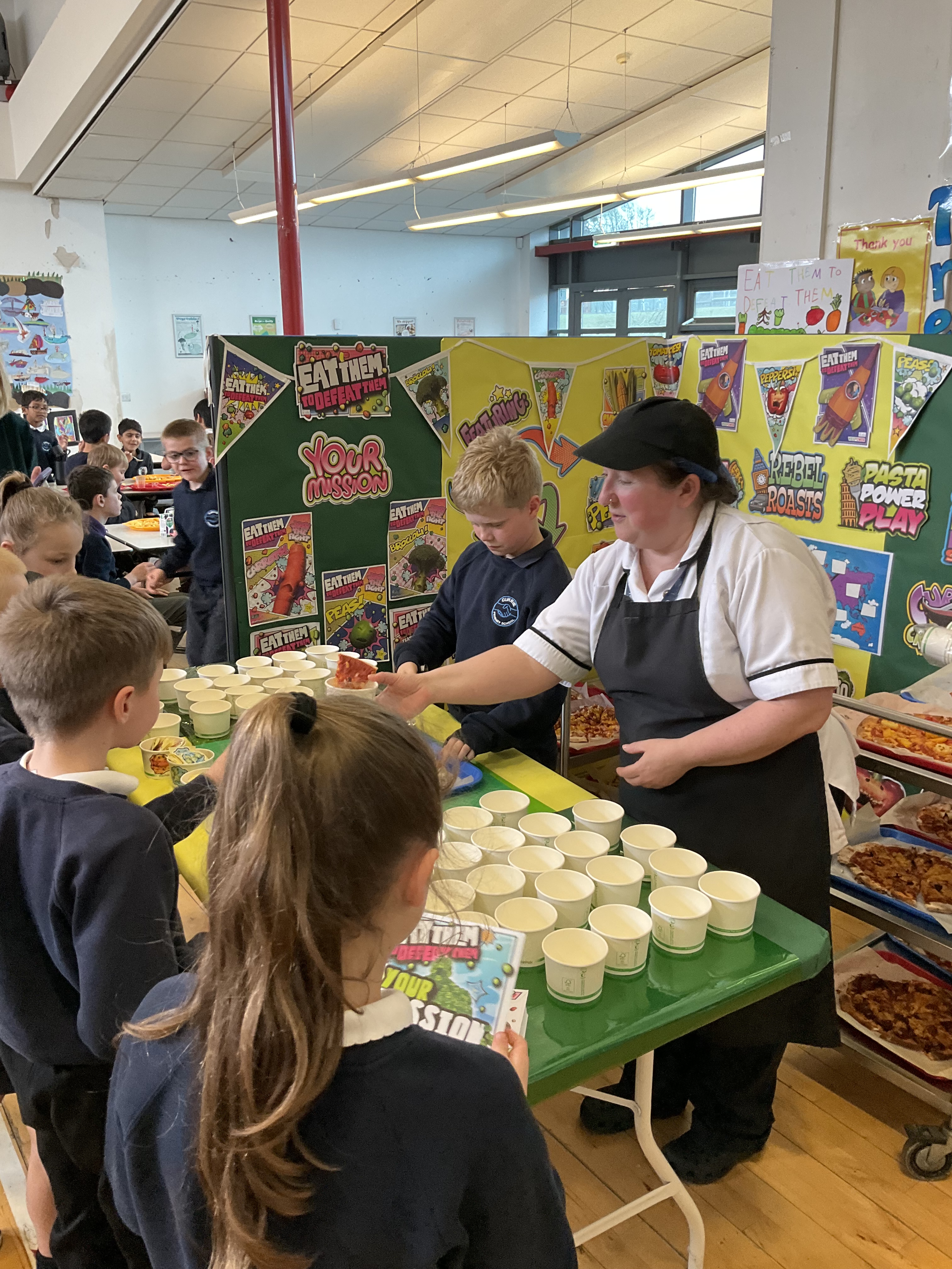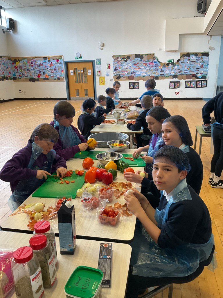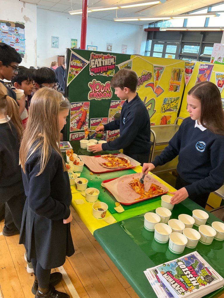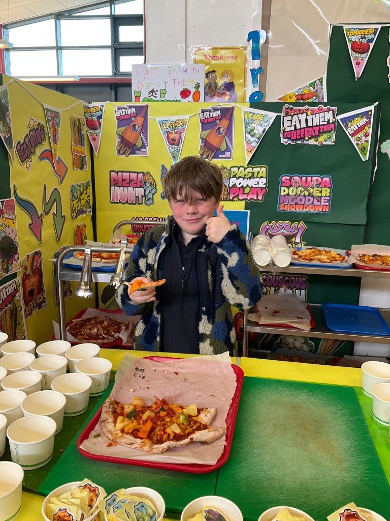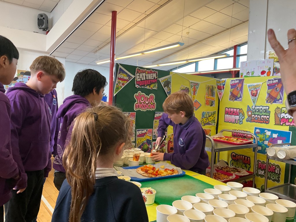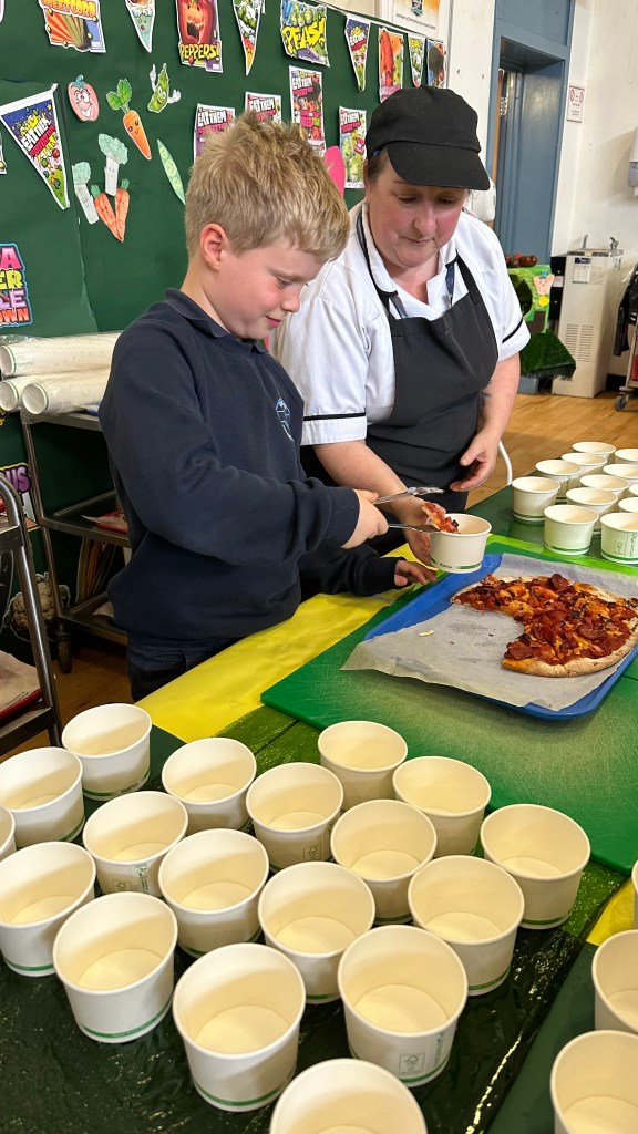 Our ‘Eat Them To Defeat Them’ pupil group enjoyed a morning working with our dinner ladies last week making pizza with a range of toppings for us all for lunch and then serving it to us. The pizzas were delicious and very popular! A huge thank you to Miss Blackwood and all of the ladies in our dinner hall for making this happen for our pupils.