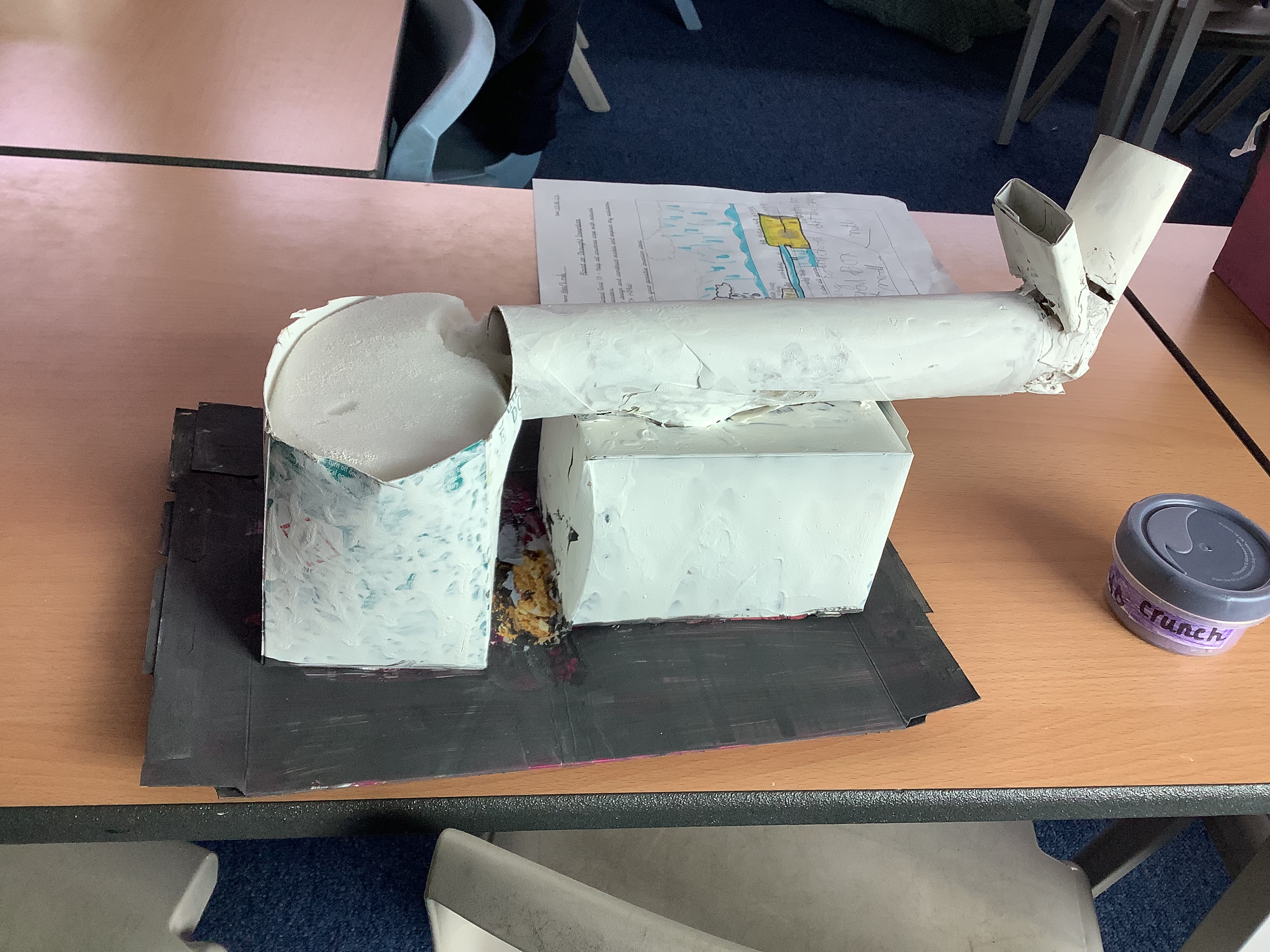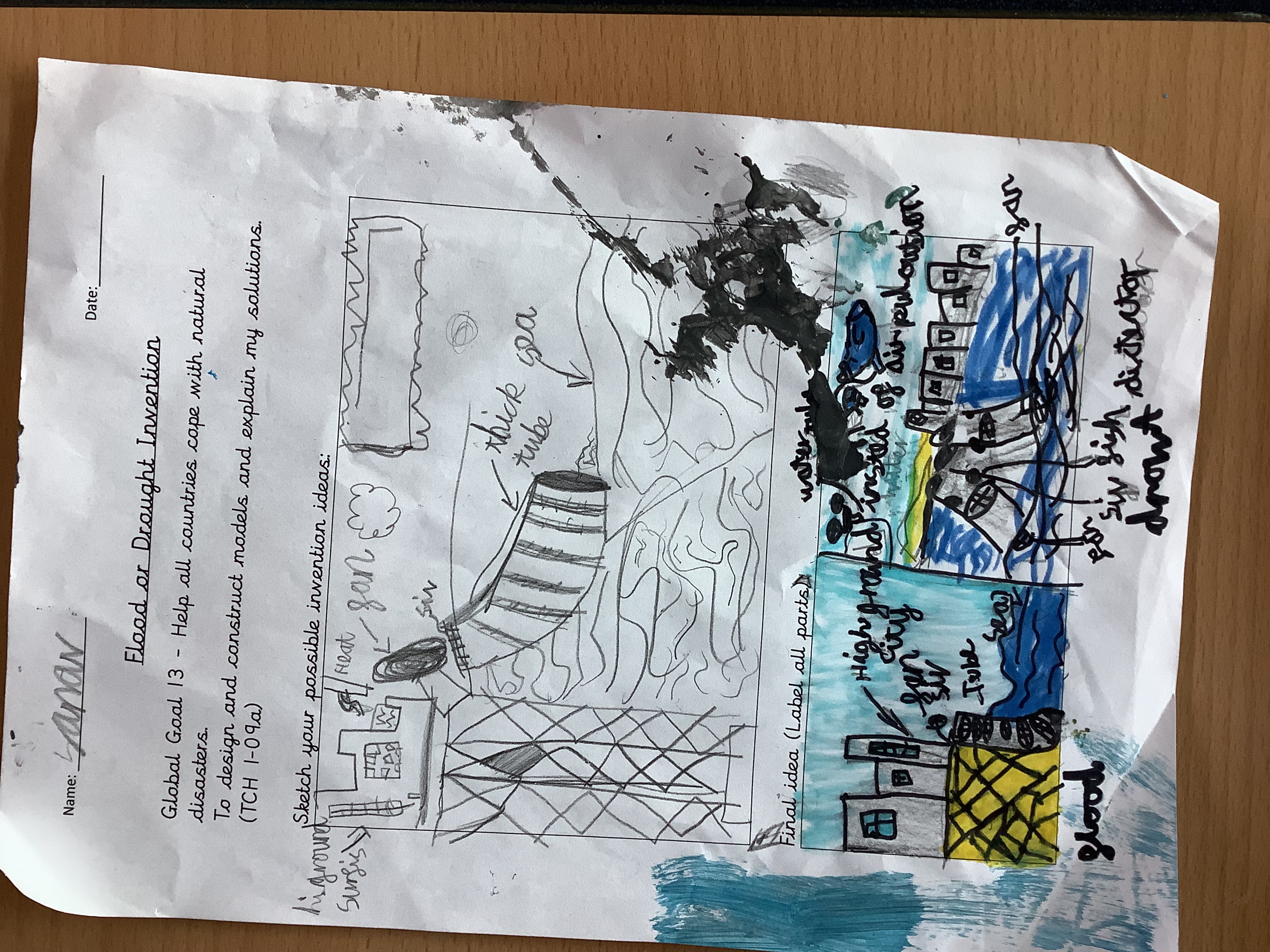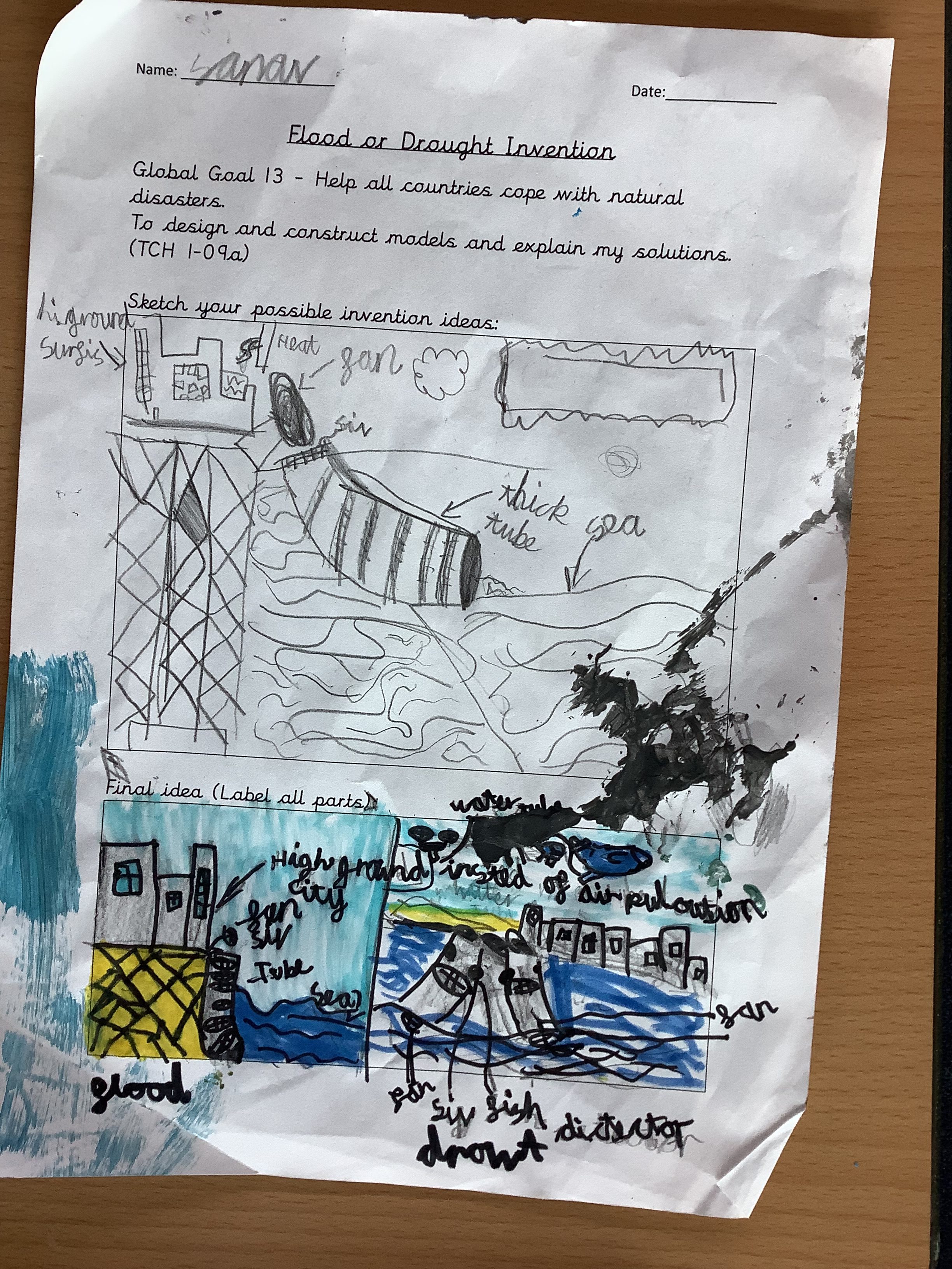 We built models that could, in real life, save farms and people from droughts and floods. This is part of Global Goal 13, to help countries with natural disasters. We used junk to build the models after we planned our designs and thought about what they would be made from in real life.