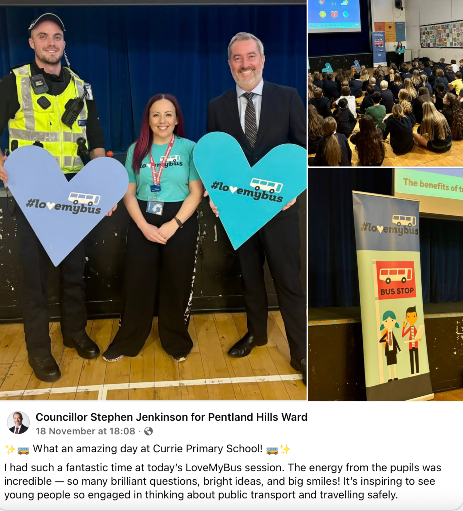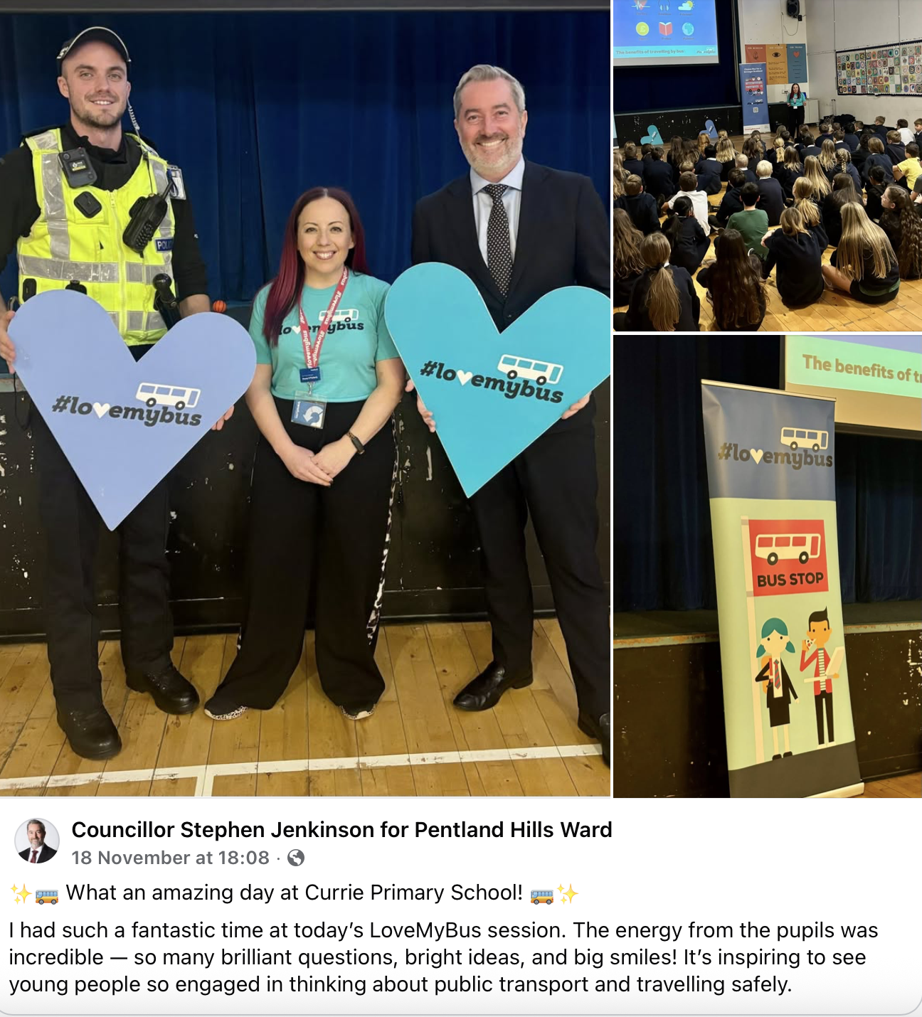 All P5, 6 and 7 classes attended workshops with Stacey from Love My Bus on Tuesday 18 November 2025. They learned about the benefits of travelling by bus, how public transport connects people and places, protecting the planet, keeping us healthy, using their free bus passes to the maximum and bus safety and respect (which included antisocial behaviour, personal safety and vandalism). The children asked great questions and were engaged with the activities in the workshops. We got lots of nice publicity for hosting this event too – thank you Mrs Strange for organising this for us.
