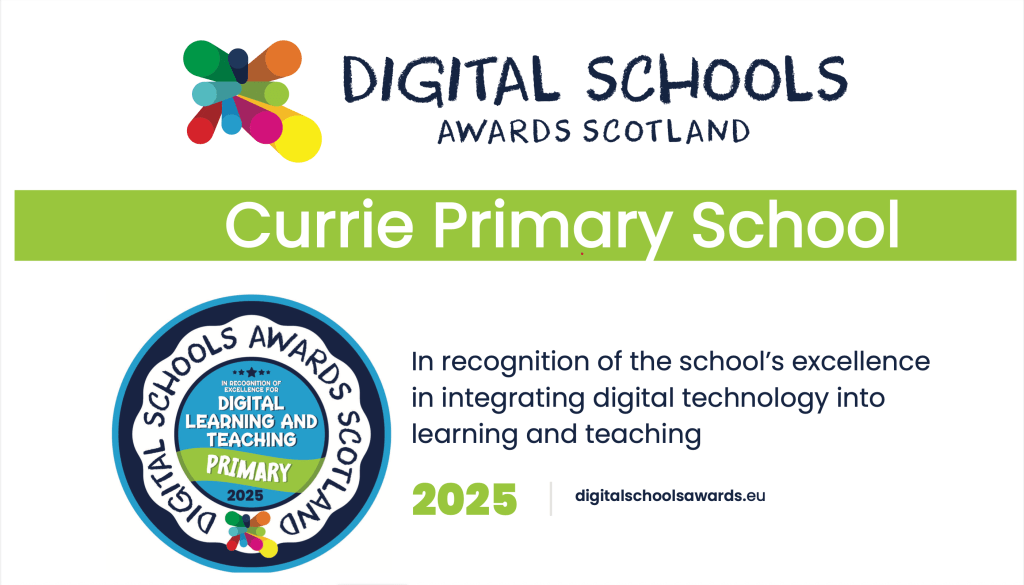 ‘Currie Primary School amply demonstrates a very strong commitment to developing the use of digital learning and technologies to support and enhance learning experiences for all its pupils. It’s quite clear that the school has established digital learning successfully as a natural element across their school community, with a clear, strong desire to continue developing the range and quality of digital experiences. Staff talked confidently, and with enthusiasm, about how and where they were using digital technologies to improve learning and to assist them in their planning and tracking of activities and learner progress. They highlighted the benefits they were noting in the ways their increased use of digital was helping the pupils to connect with organisations and individuals in ways that broaden and enhanced learning. Pupils explained confidently, eloquently and enthusiastically about how they were making use of digital in their daily tasks, and enjoying sharing their skills with others. The school’s Digital Learning Leads provide strong support for the school’s self-evaluation and professional learning processes which were enabling the digital development programme to be well targeted and make good progress. Currie Primary School is clearly committed to embedding digital technologies and ensuring continuous improvement. I believe that Currie Primary School has met the criteria for the Digital Schools Award. I recommend that the school should also be invited to become a mentor school as they have the skills and capacity to do so’.